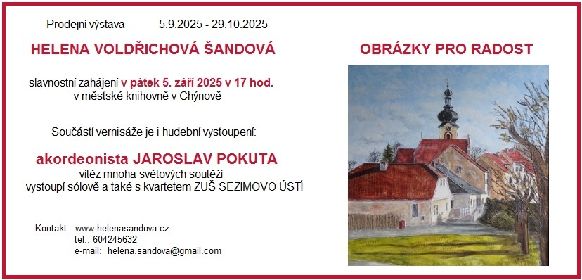 5.9.2025 v 17 hod. – slavnostní zahájení výstavy „Obrázky pro radost“ v městské knihovně v Chýnově. Součástí vernisáže bude i hudební vystoupení: akordeonista Jaroslav Pokuta, vítěz mnoha světových soutěží, vystoupí sólově a také s kvartetem ZUŠ Sezimovo Ústí. Výstava potrvá do 29.10.2025.